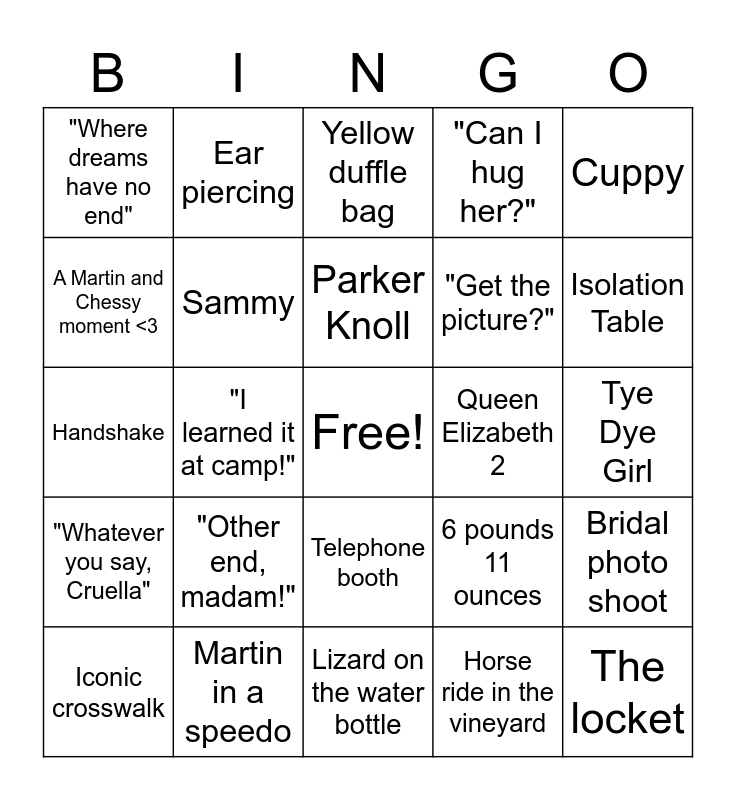 This bingo card has a free space and 29 words: Iconic crosswalk, "You rang?", "I learned it at camp!", Royal flush, "Where dreams have no end", Yellow duffle bag, Sammy, "Other end, madam!", Queen Elizabeth 2, Martin in a speedo, Tye Dye Girl, The locket, Lizard on the water bottle, Horse ride in the vineyard, Isolation Table, Aunt Vicki, Telephone booth, "Whatever you say, Cruella", Cuppy, Handshake, 6 pounds 11 ounces, Martin in leather, "Get the picture?", A Martin and Chessy moment <3, "Can I hug her?", Ear piercing, Bridal photo shoot, Parker Knoll and Cornbread and chili.