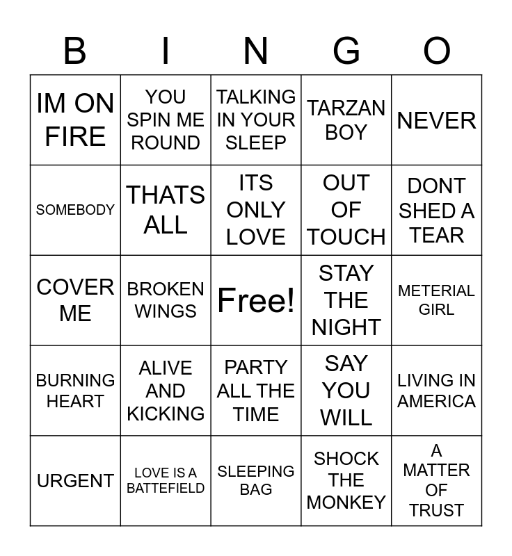This bingo card has a free space and 64 words: WALK OF LIFE, RASPBERRY BERET, WHAT YOU NEED, LIVING IN AMERICA, OH YEAH, CRUSH ON YOU, YOU SPIN ME ROUND, WHITE WEDDING, ITS ONLY LOVE, THINGS CAN ONLY GET BETTER, PARTY ALL THE TIME, CHAIN REACTION, METERIAL GIRL, NEVER, NIGHTSHIFT, SOMEBODY, BROKEN WINGS, IM ON FIRE, NEVER SURRENDER, OUT OF TOUCH, ALIVE AND KICKING, BURNING HEART, TARZAN BOY, IN MY HOUSE, GO HOME, JUMP, SOME LIKE IT HOT, HOT IN THE CITY, TOO LATE FOR GOODBYES, DONT LOSE MY NUMBER, I WANT A NEW DRUG, FAR FROM OVER, ABRACADABRA, JEOPARDY, DONT SHED A TEAR, URGENT, HARDEN MY HEART, SHOCK THE MONKEY, BIG TIME, THATS ALL, COVER ME, STAY THE NIGHT, CALIFORNIA GIRLS, STUCK WITH YOU, UNION OF THE SNAKE, A MATTER OF TRUST, LOVE IS A BATTEFIELD, WHOS JOHNNY, SAY YOU WILL, ROCK ME TONITE, WHY CANT THIS BE LOVE, GAMES PEOPLE PLAY, SLEEPING BAG, DONT CRY, SOME GUYS HAVE ALL THE LUCK, OWNER OF A LONELY HEART, TALKING IN YOUR SLEEP, KYRIE, CRUEL SUMMER, LOVERBOY, HELLO AGAIN, RUN TO YOU, SOMETHING ABOUT YOU and ROSANNA.