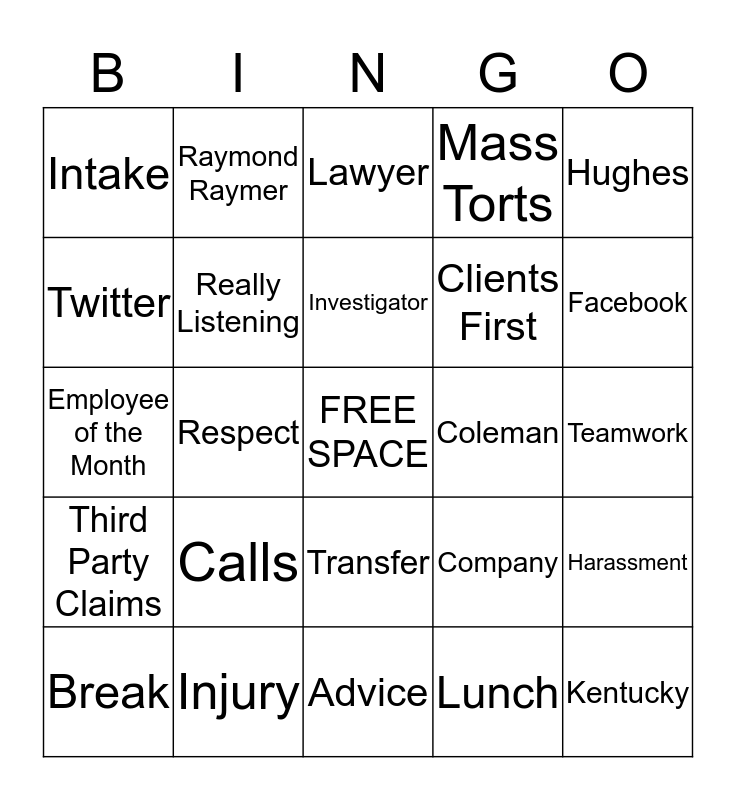 This bingo card has a free space and 28 words: Harassment, Core Value, Clients First, Lunch, Twitter, Lawyer, Raymond Raymer, Third Party Claims, Coleman, Break, Employee of the Month, Mass Torts, Injury, Advice, Facebook, Meeting, Calls, Really Listening, Investigator, Transfer, Intake, Tennessee, Kentucky, Respect, Teamwork, Company, Hughes and Brian Fisher.