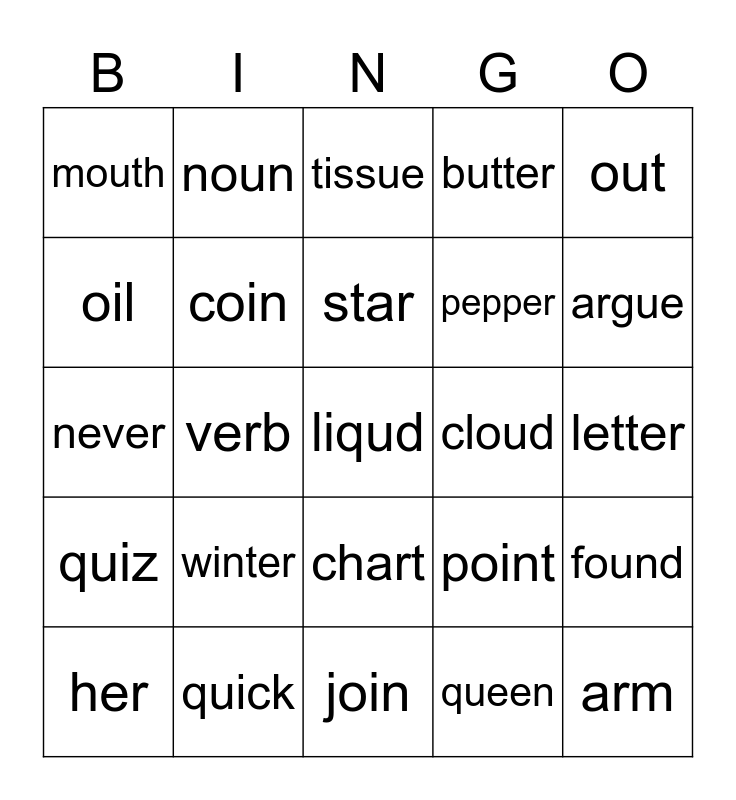 This bingo card has 25 words: quiz, quick, liqud, queen, out, mouth, noun, tissue, cloud, found, oil, coin, join, point, argue, her, verb, star, pepper, letter, never, winter, chart, butter and arm.