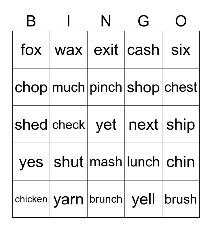 This bingo card has 25 words: yes, yarn, yet, yell, six, fox, wax, exit, next, chin, chop, much, brunch, lunch, chest, chicken, check, pinch, shop, ship, shed, shut, mash, cash and brush.