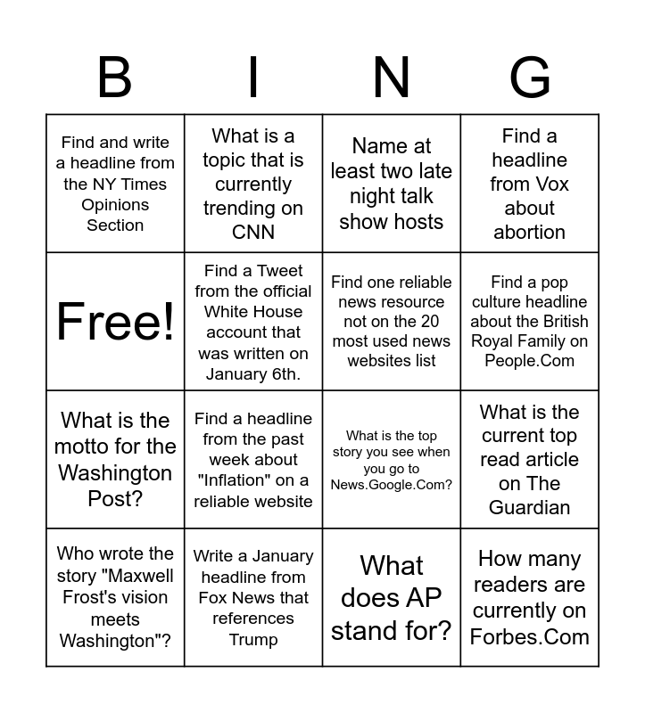 This bingo card has 16 words: Write a January headline from Fox News that references Trump, What is the current top read article on The Guardian, Name at least two late night talk show hosts, Find and write a headline from the NY Times Opinions Section, What is the motto for the Washington Post?, What is a topic that is currently trending on CNN, What is the top story you see when you go to News.Google.Com?, What does AP stand for?, Free!, Find a Tweet from the official White House account that was written on January 6th., Who wrote the story "Maxwell Frost's vision meets Washington"?, Find a headline from Vox about abortion, Find a headline from the past week about "Inflation" on a reliable website, Find a pop culture headline about the British Royal Family on People.Com, Find one reliable news resource not on the 20 most used news websites list and How many readers are currently on Forbes.Com.