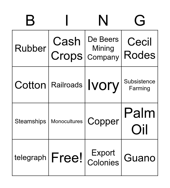 This bingo card has 16 words: Free!, Palm Oil, De Beers Mining Company, Rubber, Steamships, Cash Crops, Copper, Export Colonies, Cotton, Railroads, telegraph, Cecil Rodes, Monocultures, Subsistence Farming, Ivory and Guano.