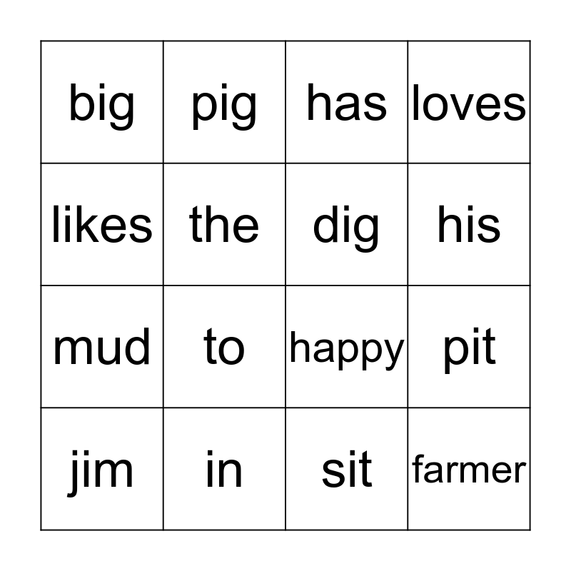 This bingo card has a free space and 15 words: jim, farmer, has, big, his, likes, to, sit, the, mud, pit, loves, dig, pig and in.