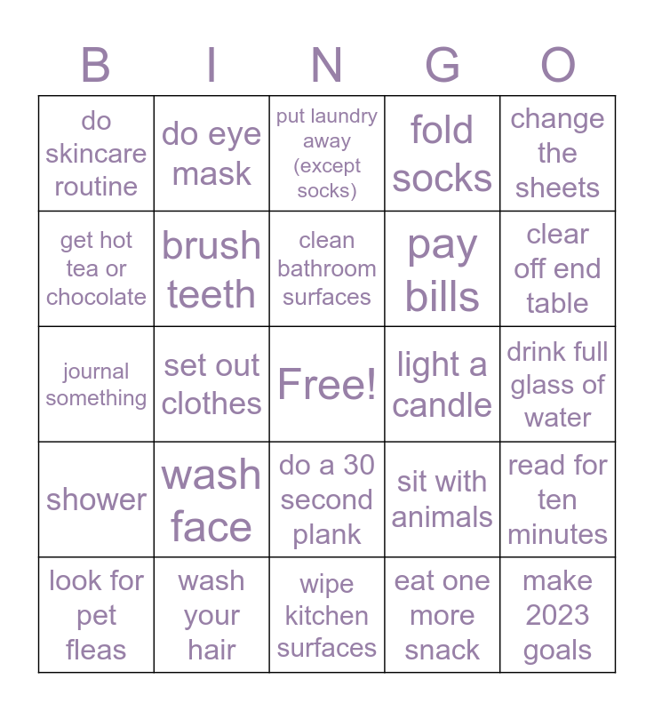 This bingo card has a free space and 24 words: wash face, wash your hair, clean bathroom surfaces, look for pet fleas, change the sheets, do skincare routine, get hot tea or chocolate, do eye mask, light a candle, do a 30 second plank, pay bills, journal something, sit with animals, read for ten minutes, brush teeth, eat one more snack, drink full glass of water, put laundry away (except socks), clear off end table, set out clothes, make 2023 goals, shower, fold socks and wipe kitchen surfaces.