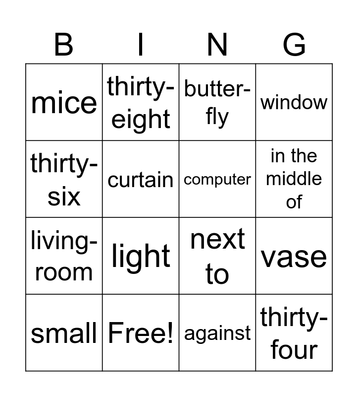 This bingo card has 31 words: spoon, room, vase, mouse, mice, butter-fly, computer, table-cloth, Free!, sofa, against, small, book-case, pillow, light, shelf, nice, tele-phone, thirty-four, thirty-five, thirty-six, thirty-seven, outside, thirty-eight, living-room, curtain, window, next to, opposite, in the middle of and CD player.