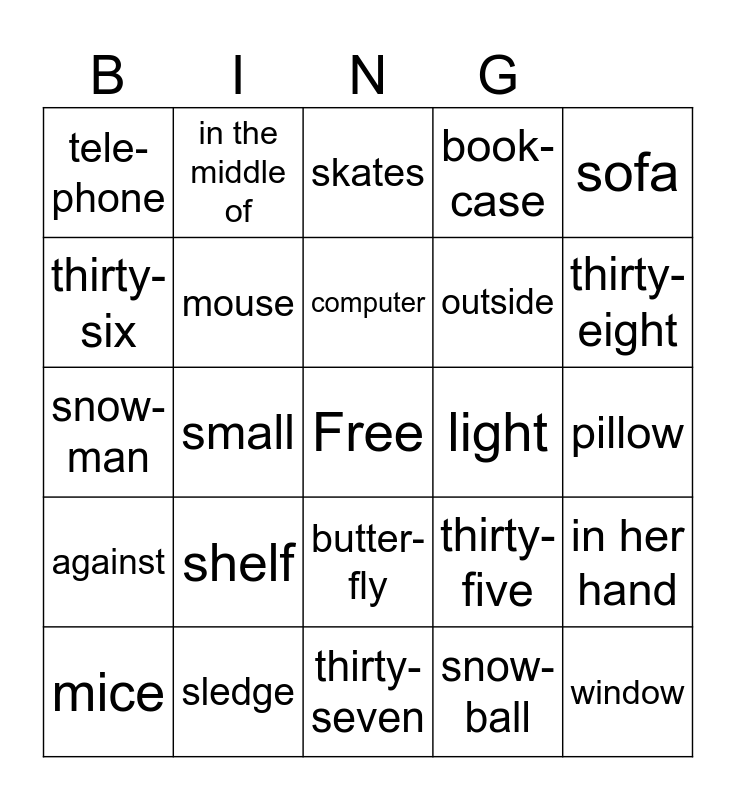 This bingo card has 39 words: spoon, room, vase, mouse, mice, butter-fly, computer, table-cloth, sofa, against, small, book-case, Free, pillow, light, shelf, nice, tele-phone, thirty-four, thirty-five, thirty-six, thirty-seven, outside, thirty-eight, living-room, curtain, window, next to, opposite, in the middle of, CD player, skis, skates, sledge, snow-ball, hand, in her hand, snow-man and thirty-nine.