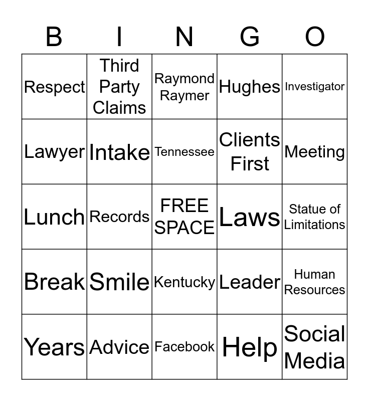 This bingo card has a free space and 28 words: Human Resources, Core Values, Clients First, Help, Lawyer, Raymond Raymer, Third Party Claims, Break, Laws, Years, Lunch, Hughes, Advice, Facebook, Meeting, Coleman, Smile, Intake, Tennessee, Kentucky, Respect, Teamwork, Social Media, Records, Statue of Limitations, Leader, Investigator and Giving Back.