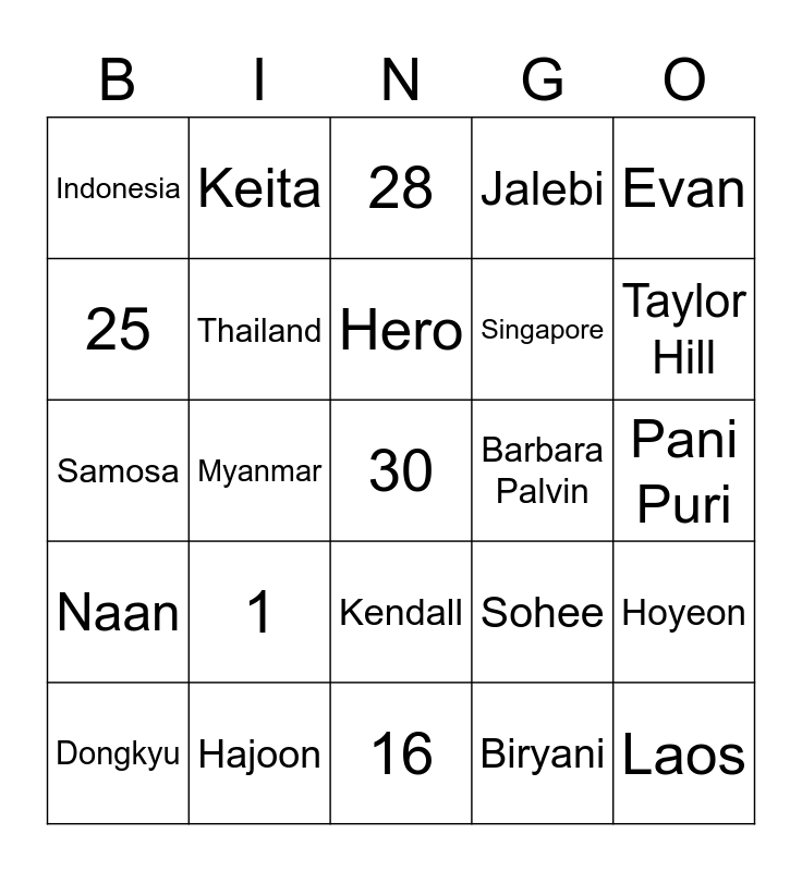This bingo card has a free space and 24 words: 1, Hajoon, Hero, Dongkyu, Evan, Indonesia, 25, Keita, Barbara Palvin, Kendall, Singapore, Samosa, Sohee, Hoyeon, Thailand, Biryani, Pani Puri, 28, Taylor Hill, Myanmar, Laos, Naan, Jalebi and 16.