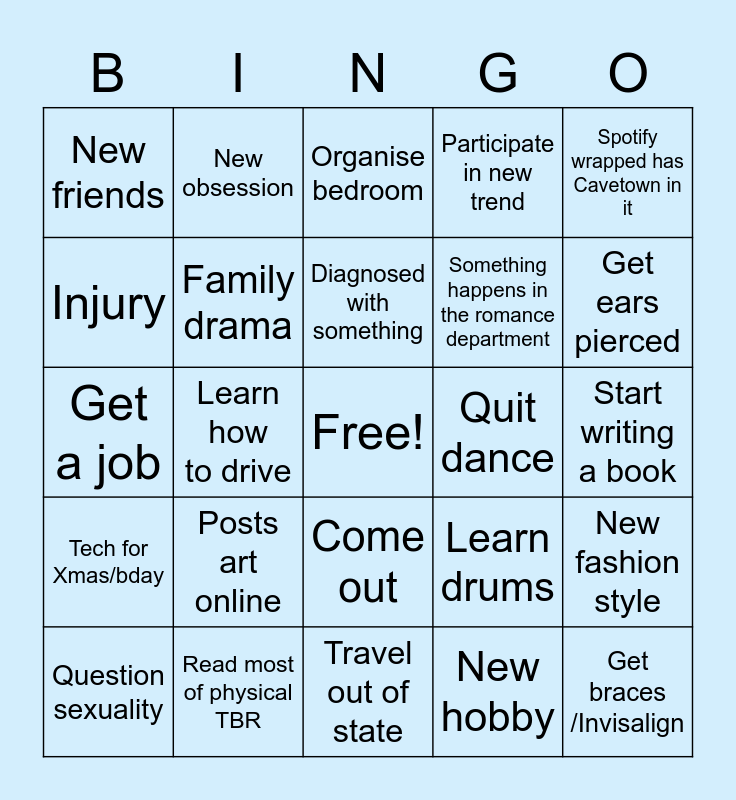 This bingo card has a free space and 24 words: Posts art online, Read most of physical TBR, Diagnosed with something, Question sexuality, Spotify wrapped has Cavetown in it, New friends, Injury, New obsession, Quit dance, Come out, Something happens in the romance department, Get a job, Learn drums, New fashion style, Family drama, New hobby, Start writing a book, Organise bedroom, Get ears pierced, Learn how to drive, Get braces /Invisalign, Tech for Xmas/bday, Participate in new trend and Travel out of state.