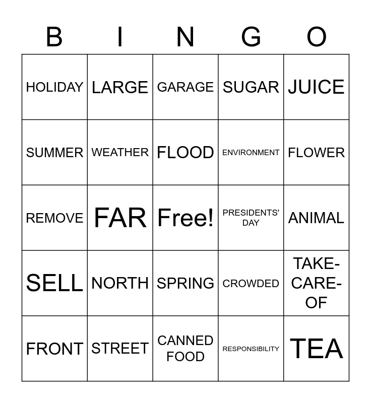 This bingo card has a free space and 39 words: COST, DOLLAR, TRAVEL, WEATHER, FRONT, SPRING, FLOOD, BASKET, JUICE, SELL, FAR, SUGAR, TEA, ANIMAL, PRESIDENTS' DAY, NORTH, BUTTER, HOLIDAY, WEST, CROWDED, SUMMER, CANNED FOOD, ENVIRONMENT, FLOWER, RIVER, TRAFFIC, OCEAN, BEACH, BUILDING, LARGE, KITCHEN, FURNITURE, GARAGE, STREET, RESPONSIBILITY, PREPARE, TAKE-CARE-OF, REMOVE and DIRTY.