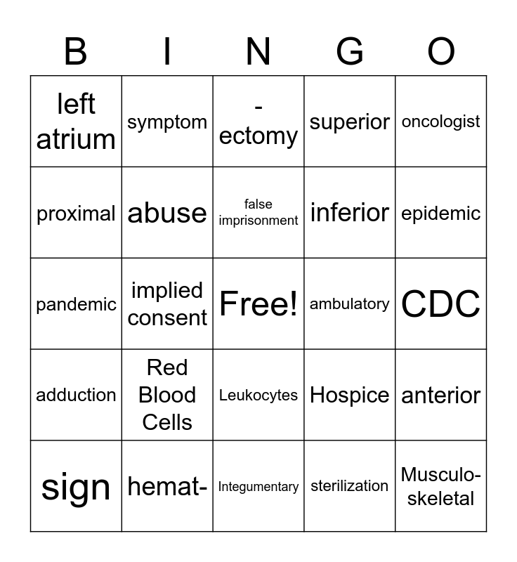 This bingo card has a free space and 33 words: negligence, -otomy, implied consent, WHO, adduction, abuse, oncologist, sign, symptom, malpractice, false imprisonment, -ectomy, geriatrician, near edge/bottom, ambulatory, epidemic, hemat-, pandemic, Red Blood Cells, Hospice, Leukocytes, right atrium, left atrium, CDC, Integumentary, Musculo-skeletal, superior, inferior, proximal, anterior, palpitation, sterilization and auscultation.