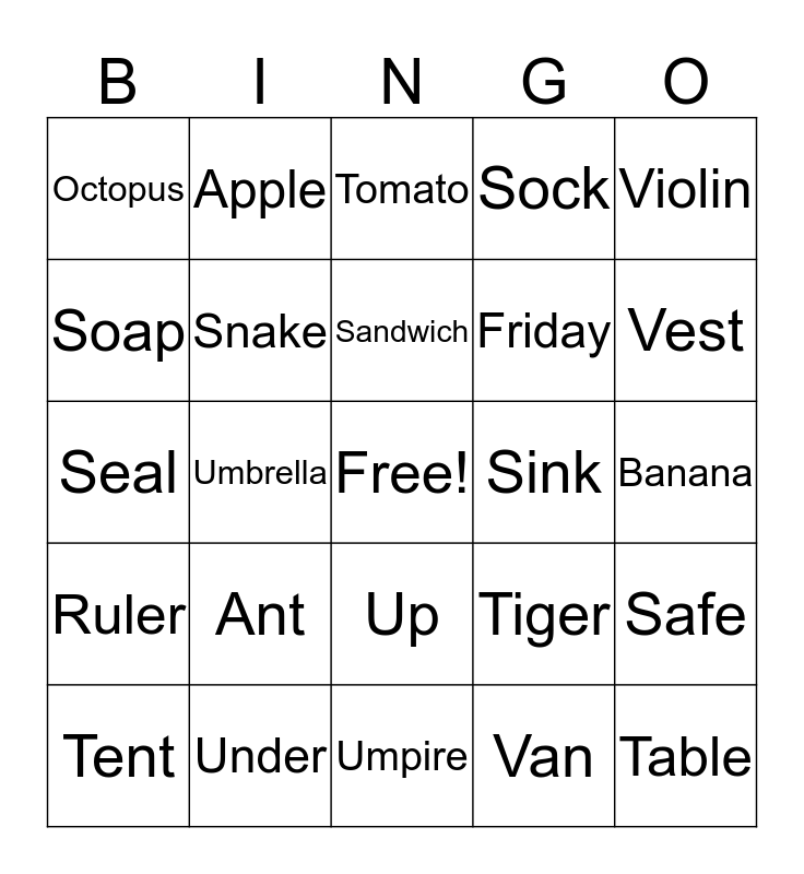 This bingo card has a free space and 24 words: Ant, Under, Sandwich, Tent, Violin, Octopus, Soap, Apple, Sink, Up, Friday, Seal, Tiger, Safe, Snake, Van, Banana, Tomato, Vest, Umbrella, Table, Ruler, Sock and Umpire.