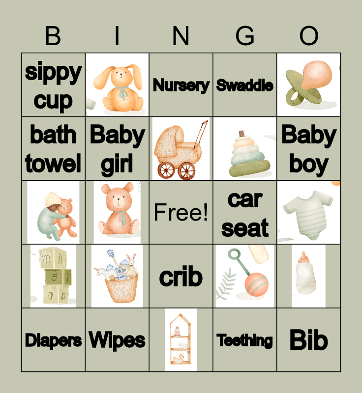 This bingo card has 12 images, a free space and 12 words: Wipes, Diapers, sippy cup, bath towel, car seat, crib, Baby girl, Teething, Nursery, Baby boy, Bib and Swaddle.