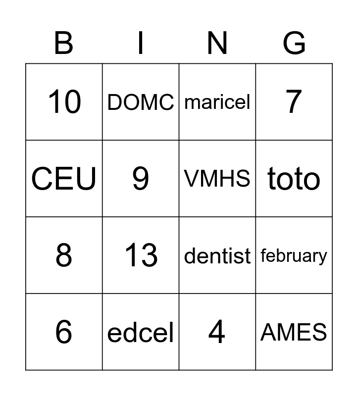 This bingo card has 32 words: 27, 1996, february, tuesday, AMES, VMHS, CEU, OLFU, DOMC, pink, toto, maricel, john, freez, edcel, navarra, ss1, dentist, sb, iced coffee, 2, 3, 4, 5, 6, 7, 8, 9, 10, 11, 12 and 13.