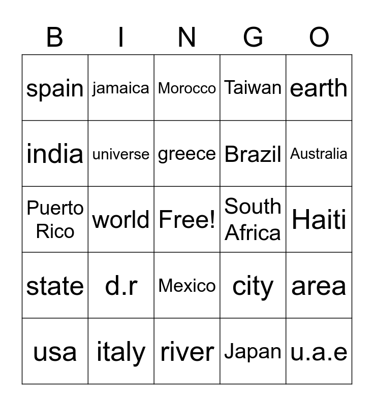 This bingo card has a free space and 24 words: d.r, italy, greece, usa, earth, spain, india, jamaica, South Africa, Mexico, Brazil, Puerto Rico, city, area, universe, Japan, Haiti, Morocco, Australia, world, u.a.e, state, Taiwan and river.