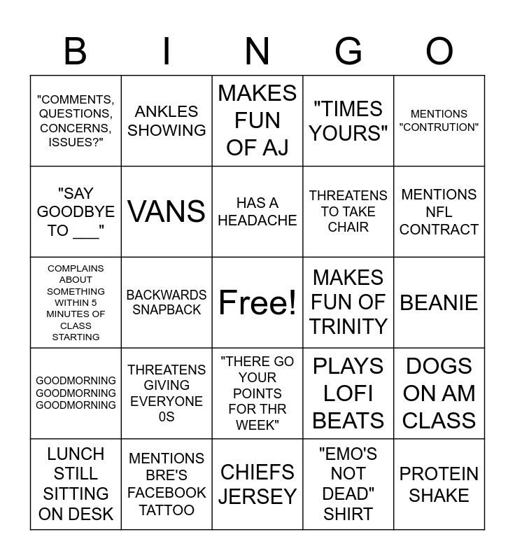 This bingo card has a free space and 24 words: THREATENS GIVING EVERYONE 0S, MENTIONS BRE'S FACEBOOK TATTOO, HAS A HEADACHE, LUNCH STILL SITTING ON DESK, MENTIONS "CONTRUTION", "COMMENTS, QUESTIONS, CONCERNS, ISSUES?", "SAY GOODBYE TO ___", ANKLES SHOWING, MAKES FUN OF TRINITY, "THERE GO YOUR POINTS FOR THR WEEK", THREATENS TO TAKE CHAIR, COMPLAINS ABOUT SOMETHING WITHIN 5 MINUTES OF CLASS STARTING, PLAYS LOFI BEATS, DOGS ON AM CLASS, VANS, "EMO'S NOT DEAD" SHIRT, BEANIE, MAKES FUN OF AJ, MENTIONS NFL CONTRACT, BACKWARDS SNAPBACK, PROTEIN SHAKE, GOODMORNING GOODMORNING GOODMORNING, "TIMES YOURS" and CHIEFS JERSEY.