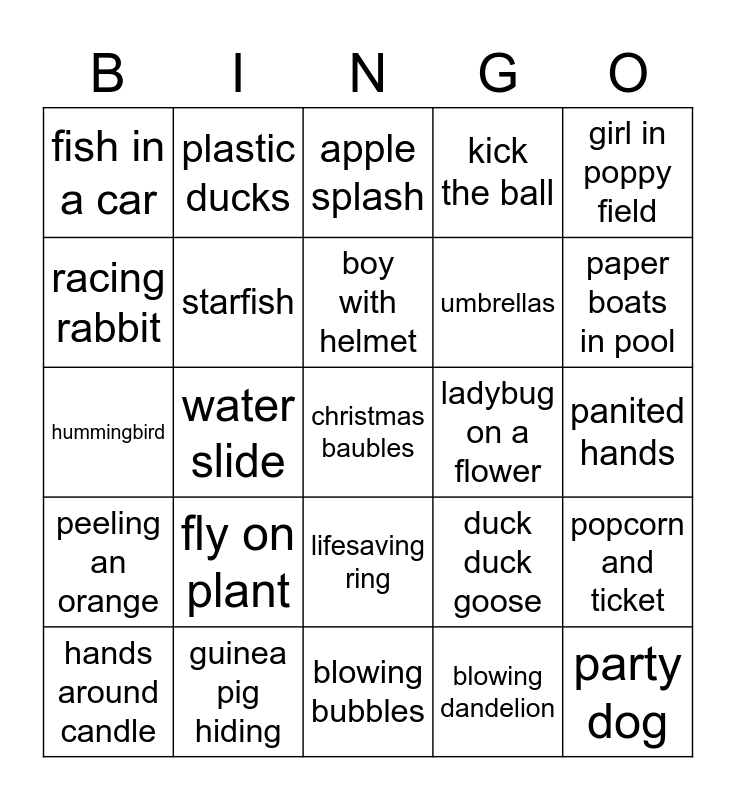 This bingo card has a free space and 45 words: baseball boy, party dog, fish out of water, hands around candle, strawberry hands, blowing dandelion, apple splash, butterfly escape, girl in poppy field, guinea pig hiding, kick the ball, ladybug on a flower, lifesaving ring, fly on plant, apple basket, blowing bubbles, honny bees, hummingbird, gumballs in the sky, paper boats in pool, plastic ducks, legs and hey, easter eggs, fish in a car, baseball field, panited hands, frogs and lilypads, goal, duck duck goose, peeling an orange, flying plane, popcorn and ticket, spider web, shell on beach, hands in, water slide, swinging chairs, dragon on wall, blue jellyfish, boy with helmet, racing rabbit, umbrellas, butterfly and flower, starfish and chef with apples.