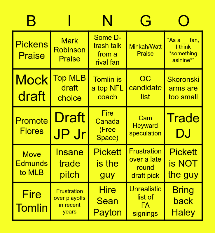 This bingo card has a free space and 24 words: Insane trade pitch, Frustration over playoffs in recent years, Tomlin is a top NFL coach, Fire Tomlin, “As a __ fan, I think *something asinine*”, Pickens Praise, Mock draft, Mark Robinson Praise, Cam Heyward speculation, Pickett is the guy, OC candidate list, Promote Flores, Frustration over a late round draft pick, Pickett is NOT the guy, Top MLB draft choice, Unrealistic list of FA signings, Trade DJ, Some D- trash talk from a rival fan, Skoronski arms are too small, Draft JP Jr, Bring back Haley, Move Edmunds to MLB, Minkah/Watt Praise and Hire Sean Payton.