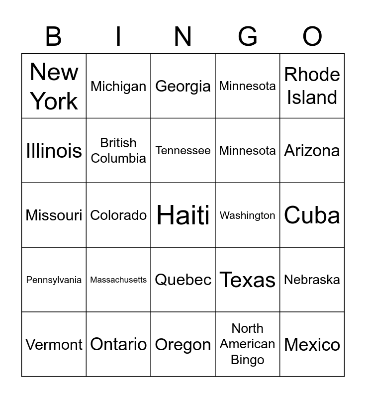 This bingo card has 30 words: Ontario, California, Colorado, Iowa, New York, Georgia, British Columbia, Quebec, Washington, Oregon, Cuba, Haiti, North American Bingo, Mexico, Arizona, Nova Scotia, Texas, Pennsylvania, Massachusetts, Rhode Island, Missouri, Ohio, Michigan, Minnesota, Illinois, Minnesota, Nebraska, Vermont, Tennessee and Oklahoma.