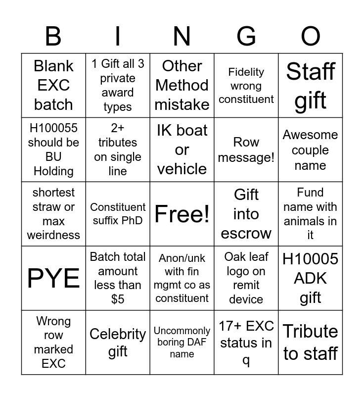 This bingo card has a free space and 61 words: 2+ batch pages, Celebrity gift, Copy/photo of cash, PYE, 17+ EXC status in q, Canada batch =>$100,000CAD, 2+ tributes on single line, Credit card lease payment, Row message!, PAC Match, Fidelity wrong constituent, EXC5, H100055 should be BU Holding, Deposit number mistake, Deposit date mistake, Blank EXC batch, Tribute to staff, Staff gift, Rev Cat with Application Other (ERR007), IK boat or vehicle, Gift into escrow, Other Method mistake, Wrong row marked EXC, H10005 ADK gift, Carbon offset/retirement, Unrestricted DAF/trb 4002, Unallowable PP, Awesome individual name, Awesome couple name, $5M+ transaction, $1-4.9M+ transaction, $500k-999k transaction, Mbrshp designation incorrectly changed, In-Kind Rev Cat 400200, 1 Gift all 3 private award types, Lobbying (do not ack), Most fun fund name, Constituent suffix PhD, TNC/BU climate gift 4002 mistake, shortest straw or max weirdness, CT EXC, Batch total amount less than $5, Fund name with animals in it, 100+pgs of docs for 1 transaction, Oak leaf logo on remit device, Donation from CEO VIP-Managed Donor, Donor first name starts "Y", Books code missing or drops off, Undesignated DAF intended for endowment, Anon/unk with fin mgmt co as constituent, Uncommonly boring DAF name, Docs way out of order, >1 currency type in Non-US template, 10+ items into exception in one batch, Holiday theme card, Gift in honor of a pet, PP on conditional pledge, Coder doesn't know docs required for EN batch, Typo in formal proposal version, Split transaction on EN batch and 20+ batch items no EXC.