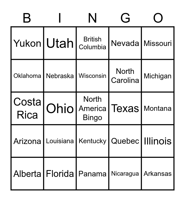 This bingo card has a free space and 29 words: Alberta, Colorado, Ohio, Florida, Yukon, British Columbia, Nebraska, Louisiana, Texas, Florida, Montana, Arkansas, Panama, Nicaragua, Michigan, Maryland, Kentucky, Arizona, Missouri, Costa Rica, Quebec, Manitoba, North Carolina, Oklahoma, Nevada, Utah, Illinois, Wisconsin and Cuba.