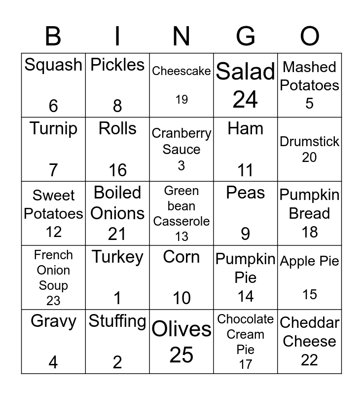 This bingo card has a free space and 24 words: Turkey 1, Stuffing 2, Cranberry Sauce 3, Gravy 4, Mashed Potatoes 5, Squash 6, Turnip 7, Pickles 8, Peas 9, Corn 10, Ham 11, Sweet Potatoes 12, Pumpkin Pie 14, Apple Pie 15, Rolls 16, Chocolate Cream Pie 17, Pumpkin Bread 18, Cheescake 19, Drumstick 20, Boiled Onions 21, Cheddar Cheese 22, French Onion Soup 23, Salad 24 and Olives 25.