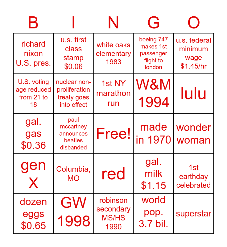This bingo card has a free space and 24 words: Columbia, MO, GW 1998, 1st NY marathon run, dozen eggs $0.65, u.s. federal minimum wage $1.45/hr, richard nixon U.S. pres., U.S. voting age reduced from 21 to 18, u.s. first class stamp $0.06, made in 1970, red, W&M 1994, gal. gas $0.36, gal. milk $1.15, 1st earthday celebrated, nuclear non-proliferation treaty goes into effect, world pop. 3.7 bil., wonder woman, white oaks elementary 1983, lulu, paul mccartney announces beatles disbanded, superstar, gen X, boeing 747 makes 1st passenger flight to london and robinson secondary MS/HS 1990.