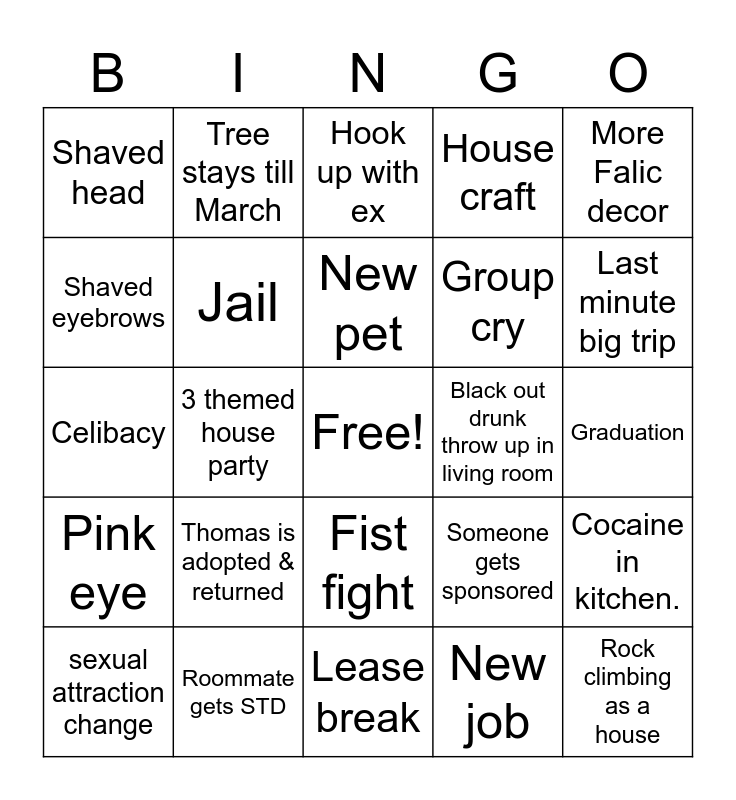 This bingo card has a free space and 24 words: Thomas is adopted & returned, Roommate gets STD, New pet, sexual attraction change, More Falic decor, Shaved head, Shaved eyebrows, Tree stays till March, Black out drunk throw up in living room, Fist fight, Group cry, Celibacy, Someone gets sponsored, Cocaine in kitchen., Jail, New job, Graduation, Hook up with ex, Last minute big trip, 3 themed house party, Rock climbing as a house, Pink eye, House craft and Lease break.