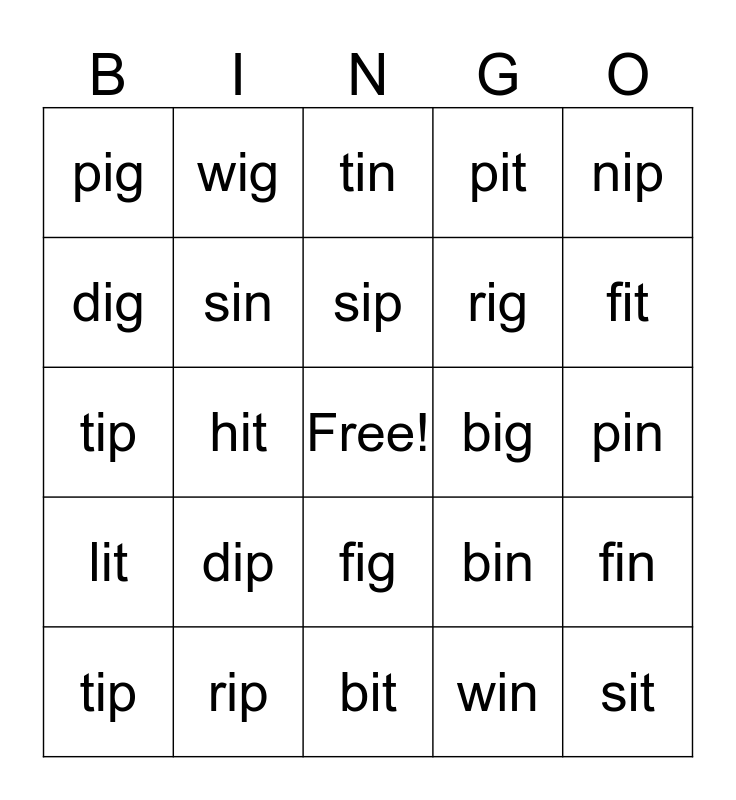 This bingo card has a free space and 24 words: dip, rip, sip, tip, nip, pig, dig, wig, big, fig, rig, tip, bin, fin, sin, win, pin, tin, fit, hit, sit, lit, pit and bit.
