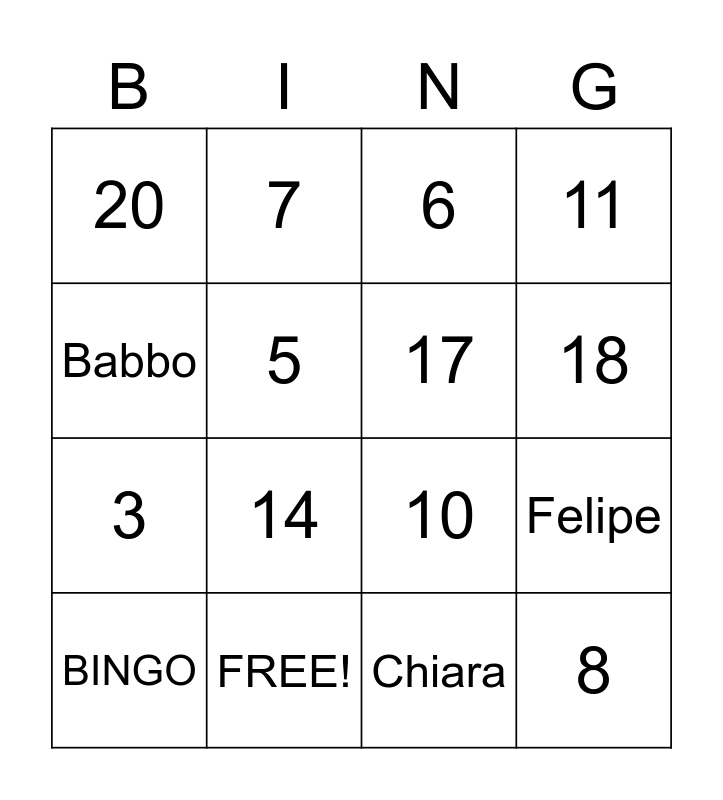 This bingo card has 28 words: 1, 2, 3, 4, 5, 6, 7, 8, FREE!, 9, 10, 11, 12, 13, 14, 15, 16, 17, 18, 19, 20, Bimbo, BINGO, Felipe, Chiara, Elio, Babbo and Mamma.