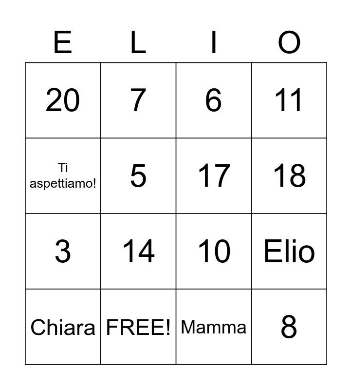 This bingo card has 28 words: 1, 2, 3, 4, 5, 6, 7, 8, FREE!, 9, 10, 11, 12, 13, 14, 15, 16, 17, 18, 19, 20, Felipe, Chiara, Elio, Mamma, Babbo, Ti aspettiamo! and Waiting for you!.
