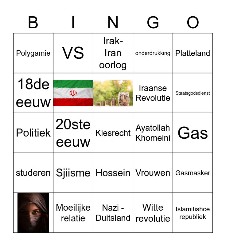 This bingo card has 3 images and 22 words: Sjiisme, Nazi - Duitsland, Platteland, Polygamie, 18de eeuw, VS, Ayatollah Khomeini, Hossein, Iraanse Revolutie, Politiek, Vrouwen, Gasmasker, Islamitishce republiek, Gas, Irak- Iran oorlog, Staatsgodsdienst, 20ste eeuw, Kiesrecht, Moeilijke relatie, studeren, onderdrukking and Witte revolutie.