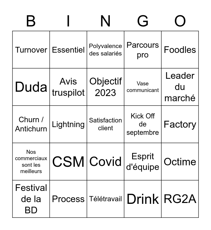 This bingo card has a free space and 34 words: 2000, Drink, Galette des rois, Challenge, Nos commerciaux sont les meilleurs, Avis truspilot, Foodles, Festival de la BD, Essentiel, local.fr, Objectif 2023, Polyvalence des salariés, Bonne année, meilleurs vœux, Collaboration, Kick Off de septembre, Leader du marché, Process, Churn / Antichurn, CSM, Esprit d'équipe, Covid, Sobriété enrgétique, Turnover, Factory, Télétravail, RG2A, Parcours pro, R.O.I, Vase communicant, Duda, Soprod, Lightning, Octime and Hubicus.