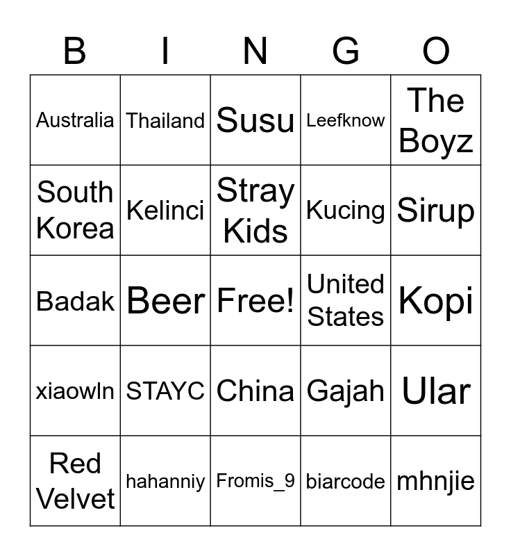 This bingo card has a free space and 25 words: STAYC, Fromis_9, Stray Kids, Red Velvet, The Boyz, Australia, South Korea, Thailand, United States, China, Kucing, Badak, Gajah, Ular, Kelinci, Teh, Kopi, Susu, Sirup, Beer, mhnjie, hahanniy, xiaowln, Leefknow and biarcode.