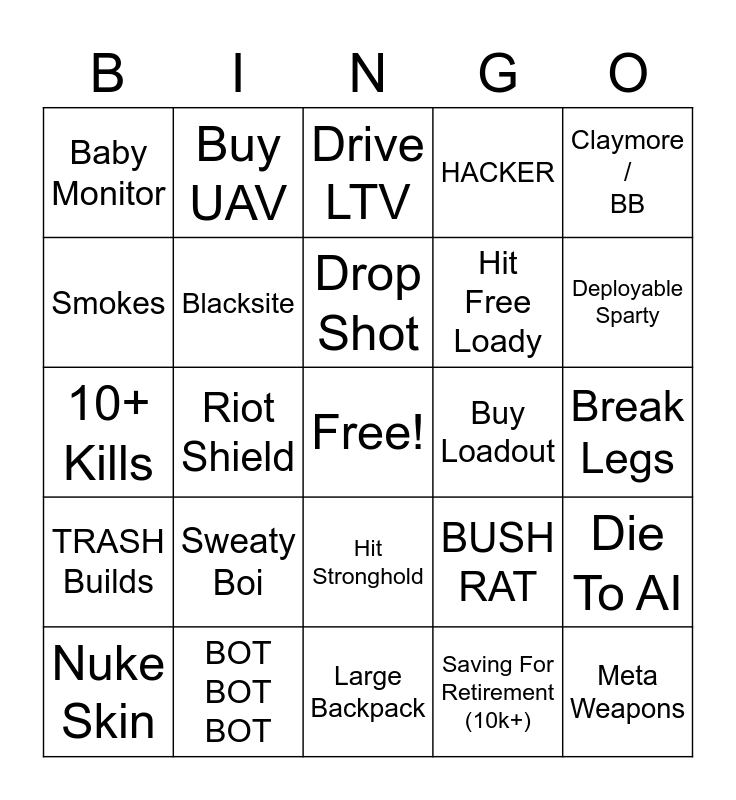 This bingo card has a free space and 24 words: Sweaty Boi, BOT BOT BOT, Drop Shot, Nuke Skin, Claymore / BB, Baby Monitor, Smokes, Buy UAV, Buy Loadout, Hit Stronghold, Hit Free Loady, 10+ Kills, BUSH RAT, Die To AI, Blacksite, Saving For Retirement (10k+), Break Legs, Drive LTV, Deployable Sparty, Riot Shield, Meta Weapons, TRASH Builds, HACKER and Large Backpack.