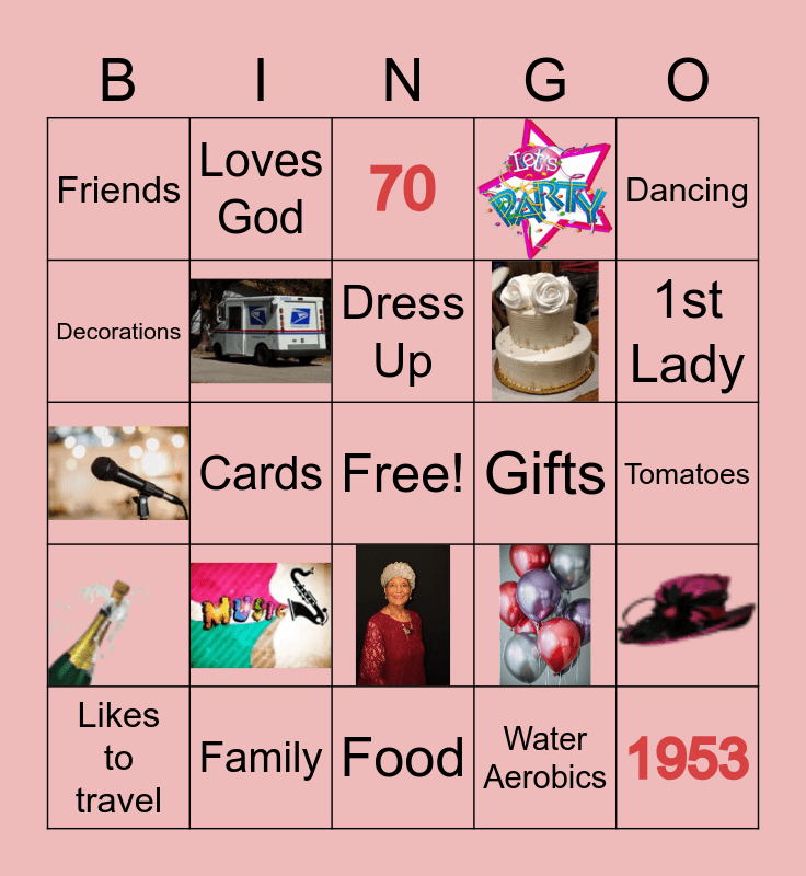 This bingo card has 9 images, a free space and 15 words: Family, Dress Up, Likes to travel, Dancing, Friends, Decorations, Loves God, Gifts, Water Aerobics, Tomatoes, 70, 1st Lady, Cards, 1953 and Food.