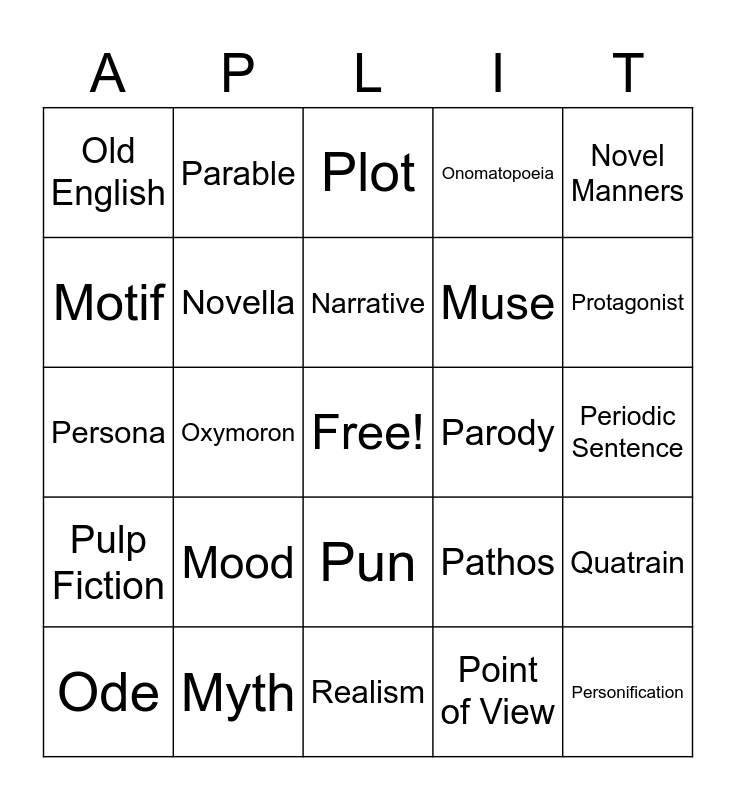 This bingo card has a free space and 24 words: Mood, Myth, Narrative, Ode, Novel Manners, Old English, Motif, Parable, Parody, Pun, Muse, Persona, Pathos, Quatrain, Novella, Point of View, Periodic Sentence, Plot, Protagonist, Oxymoron, Personification, Pulp Fiction, Onomatopoeia and Realism.