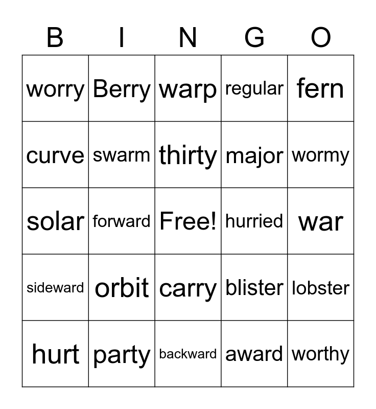 This bingo card has a free space and 24 words: orbit, party, thirty, hurt, fern, worry, curve, Berry, hurried, carry, major, solar, blister, lobster, swarm, award, war, warp, wormy, forward, worthy, sideward, regular and backward.