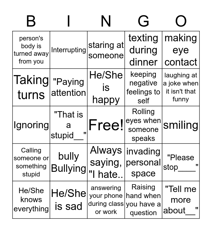 This bingo card has a free space and 24 words: bully Bullying, He/She is sad, He/She is happy, He/She knows everything, making eye contact, person's body is turned away from you, Taking turns, Interrupting, Rolling eyes when someone speaks, Always saying, "I hate.., keeping negative feelings to self, Ignoring, invading personal space, "Please stop____", "Paying attention, Raising hand when you have a question, smiling, staring at someone, laughing at a joke when it isn't that funny, "That is a stupid__", "Tell me more about__", Calling someone or something stupid, texting during dinner and answering your phone during class or work.