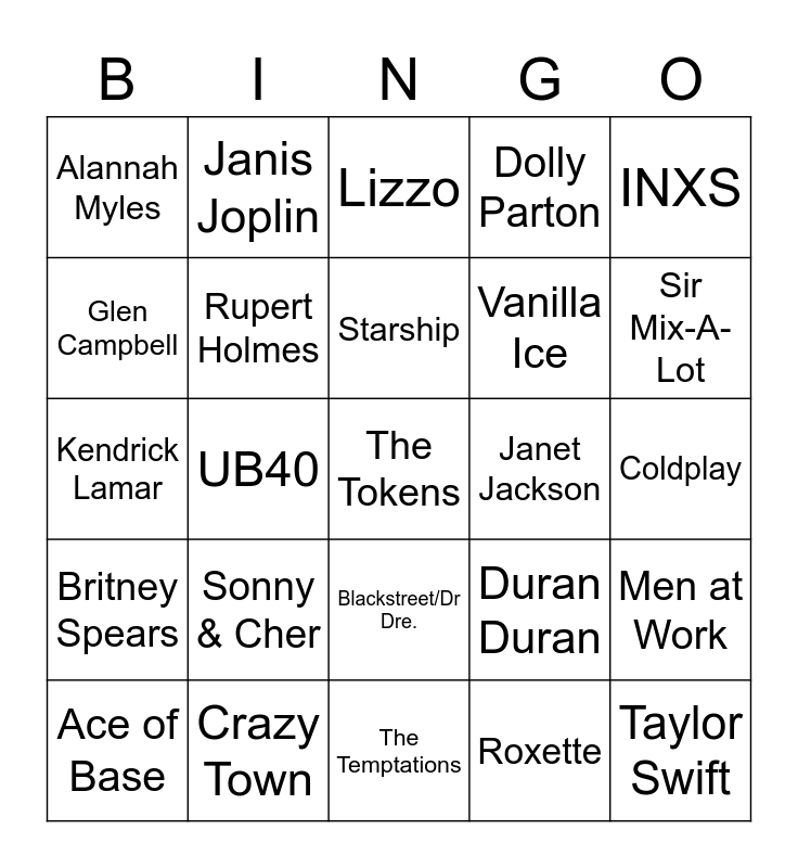 This bingo card has 49 words: The Champs, The Tokens, The Beach Boys, The Temptations, Sonny & Cher, The Lovin' Spoonful, Janis Joplin, Eric Clapton, Glen Campbell, Hall & Oates, Rupert Holmes, Dolly Parton, Men at Work, Duran Duran, Survivor, Prince, Starship, Janet Jackson, Lisa Lisa & Cult Jam, INXS, UB40, Roxette, Alannah Myles, Vanilla Ice, PM Dawn, Sir Mix-A-Lot, Ace of Base, Bone Thugs N Harmony, Blackstreet/Dr Dre., Britney Spears, Jennifer Lopez, Ja Rule, TLC, Los Del Rio, Hanson, Crazy Town, 50 Cent, Fergie, Maroon 5, Coldplay, Pink, Black Eyed Peas, Adele, Taylor Swift, Pharrell Williams, Kendrick Lamar, Lizzo, Cardi B, Bruno Mars and Olivia Rodrigo.