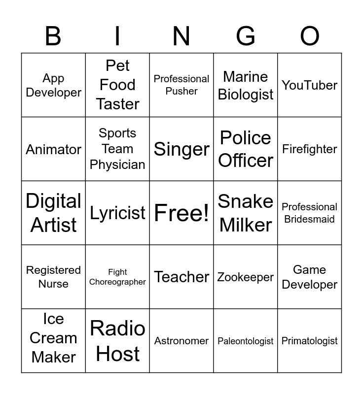 This bingo card has a free space and 29 words: Ice Cream Maker, Beekeeper, Lyricist, Voice-Over Actor, App Developer, Professional Pusher, Sports Team Physician, Fight Choreographer, Snake Milker, Radio Host, Professional Bridesmaid, Primatologist, Astronomer, Paleontologist, Firefighter, Pro-Athlete, Teacher, Registered Nurse, YouTuber, Digital Artist, Zookeeper, Air Force, Police Officer, Animator, Marine Biologist, Pet Food Taster, Game Developer, Singer and Fashion Designer.