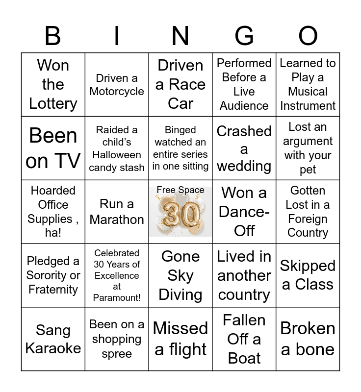 This bingo card has a free space and 24 words: Celebrated 30 Years of Excellence at Paramount!, Been on a shopping spree, Binged watched an entire series in one sitting, Sang Karaoke, Learned to Play a Musical Instrument, Won the Lottery, Been on TV, Driven a Motorcycle, Won a Dance-Off, Gone Sky Diving, Crashed a wedding, Hoarded Office Supplies , ha!, Lived in another country, Skipped a Class, Raided a child’s Halloween candy stash, Fallen Off a Boat, Gotten Lost in a Foreign Country, Driven a Race Car, Lost an argument with your pet, Run a Marathon, Broken a bone, Pledged a Sorority or Fraternity, Performed Before a Live Audience and Missed a flight.