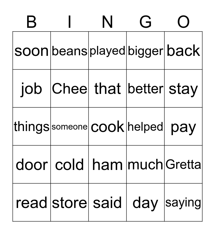 This bingo card has a free space and 24 words: cold, store, that, read, back, soon, job, beans, helped, ham, better, things, much, Gretta, Chee, day, pay, played, stay, someone, saying, door, bigger and said.