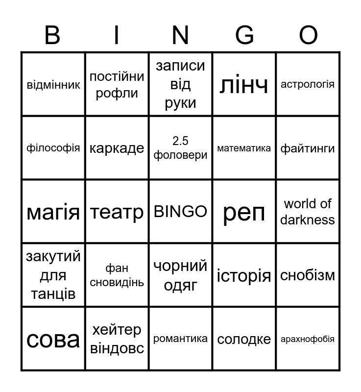 This bingo card has a free space and 24 words: фан сновидінь, хейтер віндовс, 2.5 фоловери, сова, астрологія, відмінник, філософія, постійни рофли, реп, чорний одяг, математика, магія, історія, снобізм, каркаде, солодке, world of darkness, записи від руки, файтинги, театр, арахнофобія, закутий для танців, лінч and романтика.