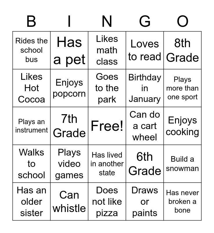 This bingo card has a free space and 24 words: Plays video games, Can whistle, Goes to the park, Has an older sister, 8th Grade, Rides the school bus, Likes Hot Cocoa, Has a pet, Can do a cart wheel, Has lived in another state, Birthday in January, Plays an instrument, 6th Grade, Build a snowman, Enjoys popcorn, Draws or paints, Enjoys cooking, Likes math class, Plays more than one sport, 7th Grade, Has never broken a bone, Walks to school, Loves to read and Does not like pizza.