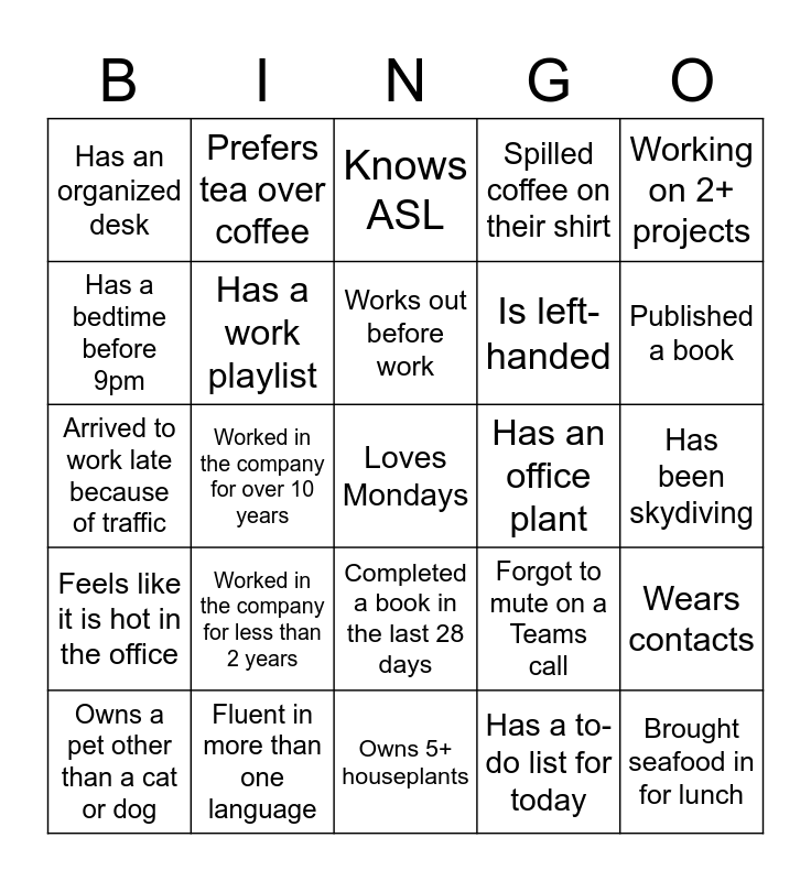 This bingo card has a free space and 29 words: Owns a pet other than a cat or dog, Has to leave early today, Worked in the company for over 10 years, Sent out a meeting request, Has an organized desk, Knows ASL, Has a work playlist, Worked in the company for less than 2 years, Has an office plant, Fluent in more than one language, Has been skydiving, Brought seafood in for lunch, Owns 5+ houseplants, Has a to-do list for today, Published a book, Bought lunch today, Completed a book in the last 28 days, Feels like it is hot in the office, Working on 2+ projects, Arrived to work late because of traffic, Forgot to mute on a Teams call, Played a sport in college, Is left-handed, Has a bedtime before 9pm, Spilled coffee on their shirt, Prefers tea over coffee, Wears contacts, Works out before work and Does not drink coffee.
