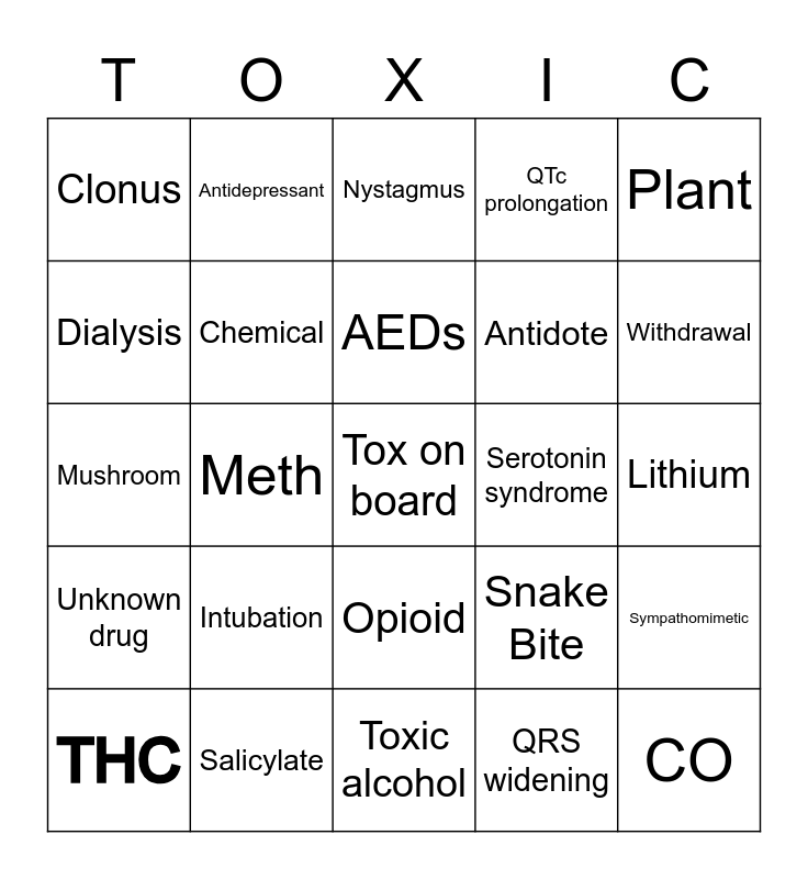 This bingo card has a free space and 29 words: THC, Tylenol, Meth, Anticholinergic, Clonus, Nystagmus, Chemical, Intubation, Serotonin syndrome, Salicylate, Lithium, CO, Toxic alcohol, QRS widening, Withdrawal, Sedative/hypnotic, Opioid, Unknown drug, Plant, Mushroom, Snake Bite, Antipsychotic, Antidote, Dialysis, QTc prolongation, Antidepressant, Sympathomimetic, AEDs and Miosis.