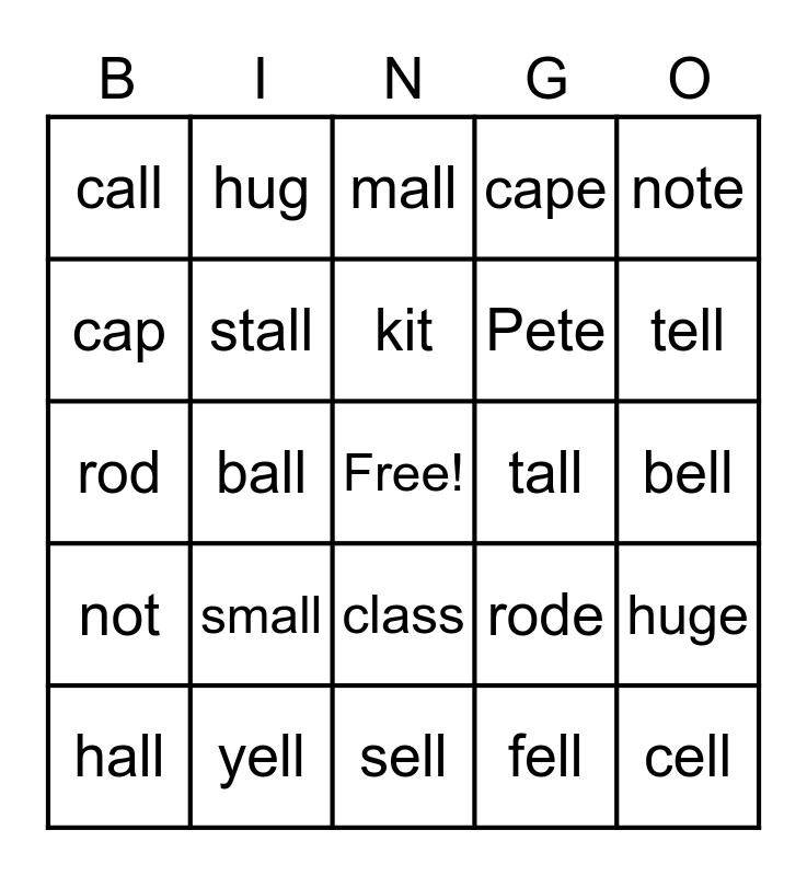 This bingo card has a free space and 29 words: hall, fall, ball, wall, call, mall, stall, small, tall, yell, bell, cell, sell, fell, tell, well, class, not, note, rod, rode, pet, Pete, cap, cape, hug, huge, kit and kite.