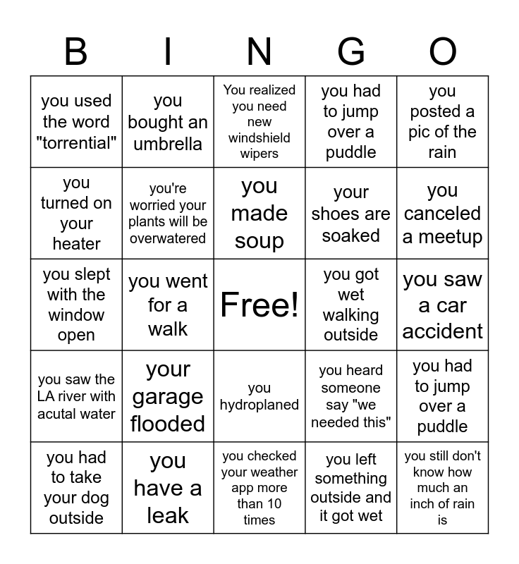This bingo card has a free space and 24 words: your garage flooded, you have a leak, you made soup, you had to take your dog outside, you posted a pic of the rain, you used the word "torrential", you turned on your heater, you bought an umbrella, you got wet walking outside, you hydroplaned, your shoes are soaked, you slept with the window open, you heard someone say "we needed this", you had to jump over a puddle, you're worried your plants will be overwatered, you left something outside and it got wet, you saw a car accident, You realized you need new windshield wipers, you canceled a meetup, you went for a walk, you still don't know how much an inch of rain is, you saw the LA river with acutal water, you had to jump over a puddle and you checked your weather app more than 10 times.